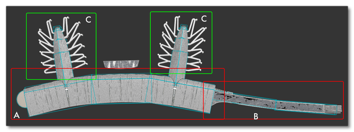 In this example element the glTF would cover an area of approximately 800m². It might be interesting to split this asset into 4 nodes and two instances, like this: