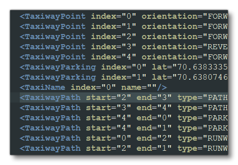 This page lists the different elements and attributes required to generate properly formed XML for taxiways into airports. The information on this page is used along with the information for creating an Airport - since approaches are specifically for airports - which can be found here: