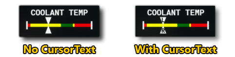 This element is a sub-element of <Gauge>, has no attributes, and is used to define a string that will be drawn over the cursor. There is no limit to the length of this string, but due to the size of the cursor being fixed, we recommend that you only use a single character - for example "L" or "R" - since additional characters will cause the text to overspill the cursor and be unreadable. See <CursorText> for an example image.