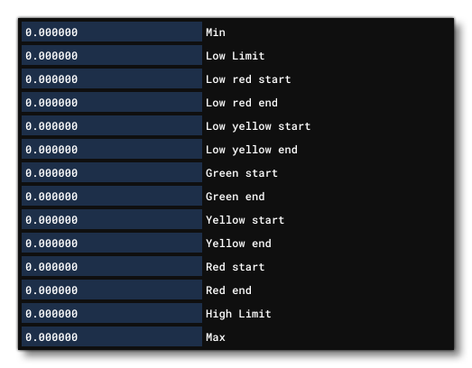 All of the sections listed below will have a combination of the following inputs to define the different colours and levels displayed visually in the HUD/glass cockpits: