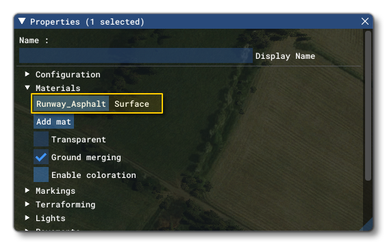 The next step requires you to expand the Materials section of the Scenery Editor Properties window, and you'll see the material that is currently applied to the runway: