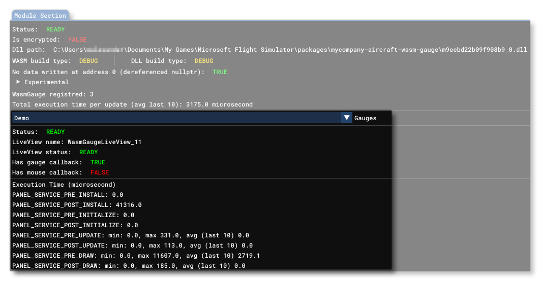 Here you will see listed the Registered WASM Gauges which is the number of gauges within the selected module that have been registered as available. Beneath this you are shown the Total Execution Time Per Update, which is a constantly updating value showing the time (in microseconds) that the module requires to update.