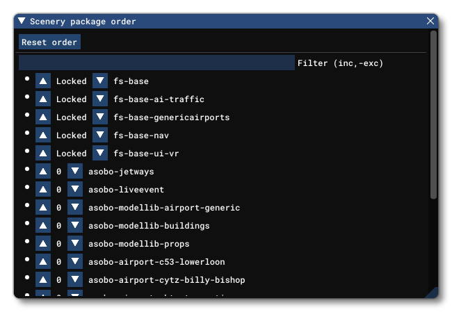 Here you can re-order the package priority for most of the packages used by the simulation. Priority starts at 0 and increments, with the lower values being mounted first and the higher values being mounted after. This can be useful to debug issues where one package overrides or conflicts with the contents of another package, or when a package has dependencies on another package. Changing package order priority is as simple as clicking on the  and  buttons, and the priority value will be shown between the two. If you make a mistake, or wish to make a fresh start, you can click the Reset Order button, which will remove the file responsible for ordering the packages and then this file will be re-created when you start to change priorities again.