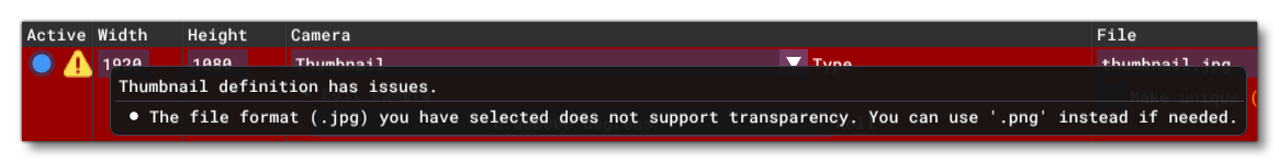While setting up the captures, the tool will automatically perform a certain amount of validation checks, and will display a warning icon if there is something wrong with a shot definition meaning it cannot be properly validated. Hovering the icon will display the list of issues the tool detected, for example: