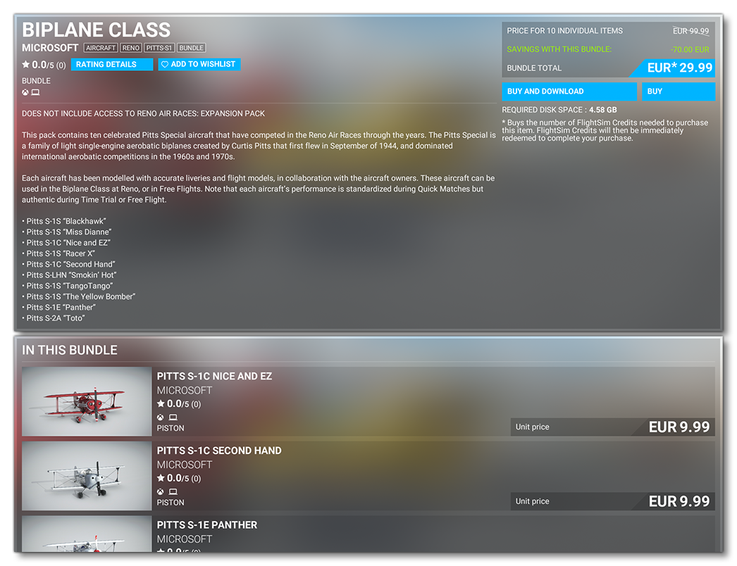 The image above shows the page for a Bundle of 10 aircraft, and shows the current price, along with a description of the bundle, and then each item in the bundle.