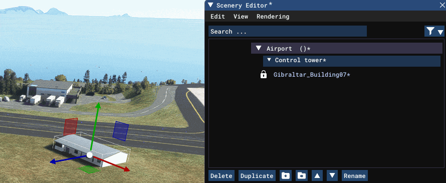 Since towers are considered scenery objects all scenery objects will be shown in the list, but you can use the filter at the top of the Objects window to narrow down the search to the objects that you want. Once you have found the tower that you want to add to the airport, click the Add button, and then use the Translate Gizmo to position the tower where you want, or you can enable One-Click Placing and simply click in the world to place it. You may also use the Rotation Gizmo to change the angle the element is shown at, as well as the Scale Gizmo to change its size.