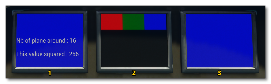There is no equivalent of the coherent call GET_AIR_TRAFFIC in WebAssembly, and so to get the number of aircraft around the user in a WASM module, a call to a JS event must be made. In this case, the WASM gauge on the left makes a call to the center JS gauge to execute the coherent call. The JS gauge returns the value in another event. -