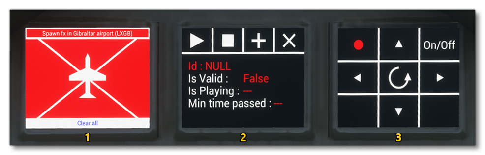 - This display permits you to spawn particles at a specific location in the world, or at specific locations on the aircraft. If you click on the text at the top - "Spawn FX In Gibraltar" - a blue particle will spawn above the position of the aircraft on the runway. Pressing this repeatedly will move up the position of the spawn point for the VFX. You may need to change to the external camera to be able to see it. If you click any of the segments around the aircraft diagram, particles will spawn in those areas of the aircraft. You can click on the "Clear All" button to clear all particles and reset the buttons.