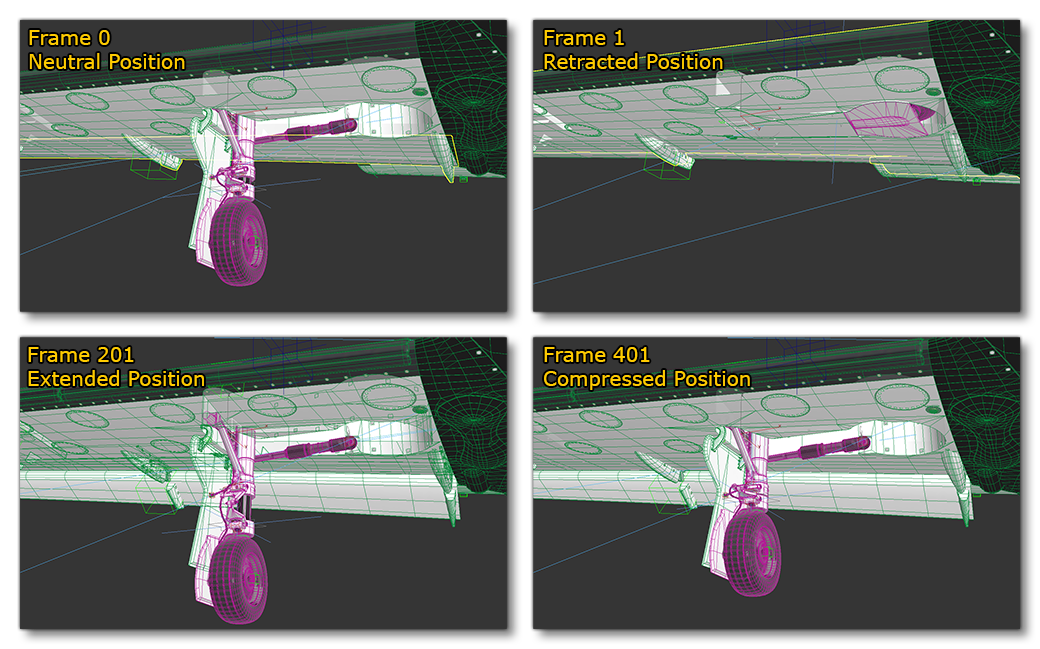 If your aircraft has retractable landing gear then the same rules outlined above still apply, ie: your animation is split into two parts with the last 50% being the landing gear compression. Only this time, the first fifty percent should be the frames showing the landing gear retracting. So, let's say our animation was 401 frames long, it would be comprised of: