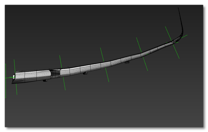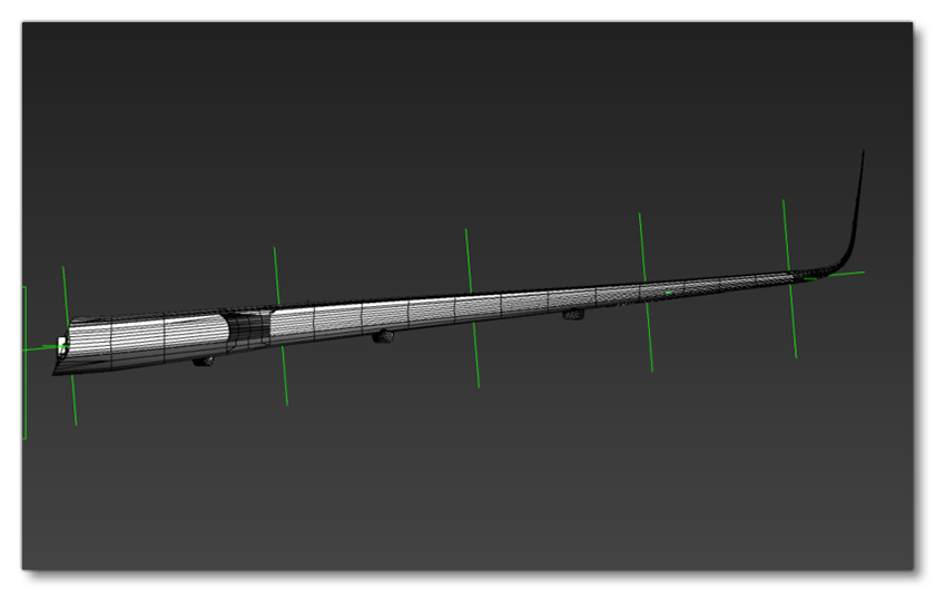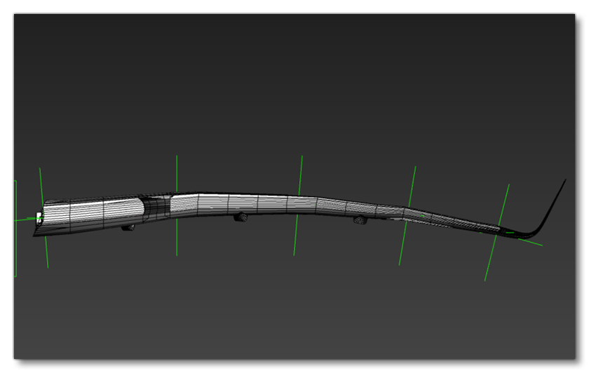 For creating a model that permits wingflex, we need to have a hierarchy of bones placed in such a way as to get the most realistic deformation. So, we recommend that you place your viewport in topview and focus on an aircraft wing, then imagine a straight line along the wing, from the fuselage to the start of the wing tip, along the center: