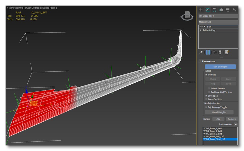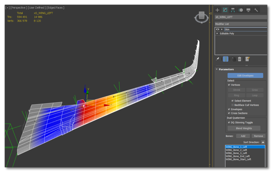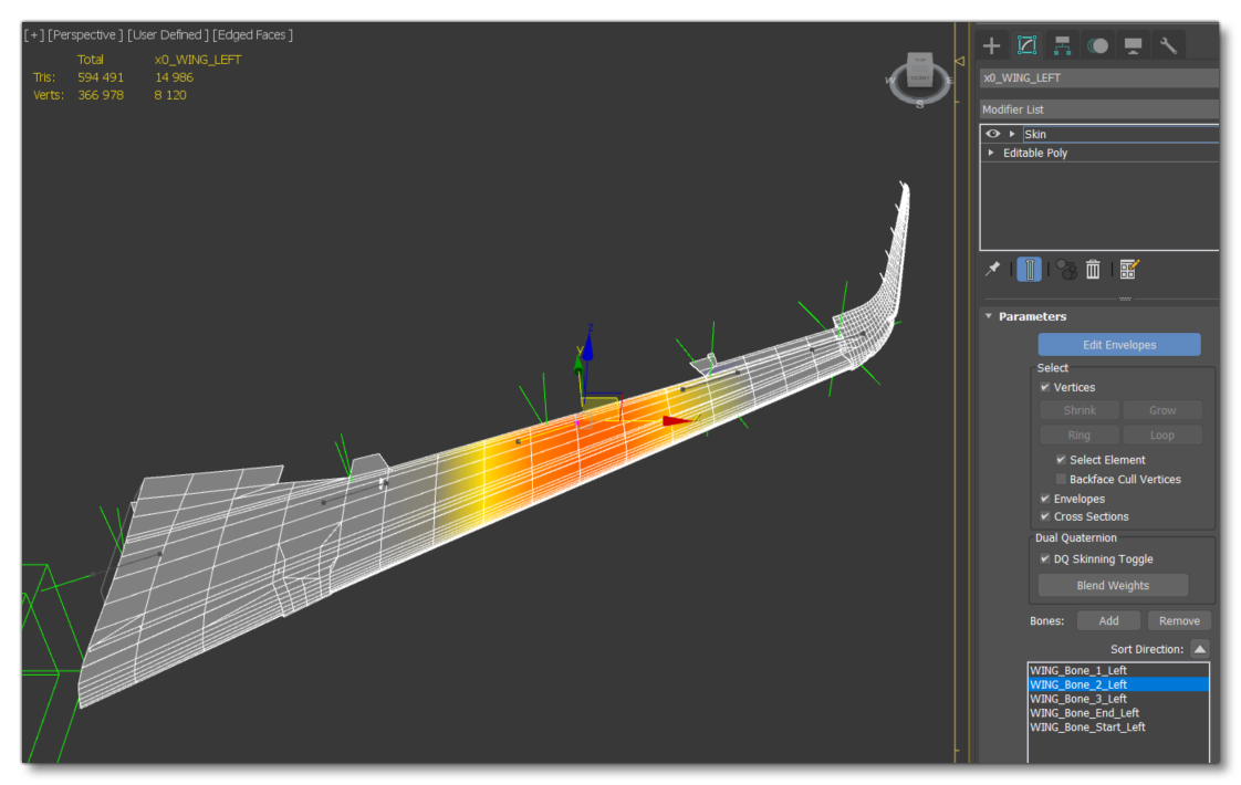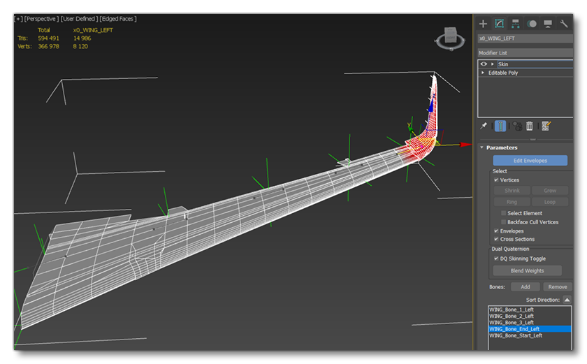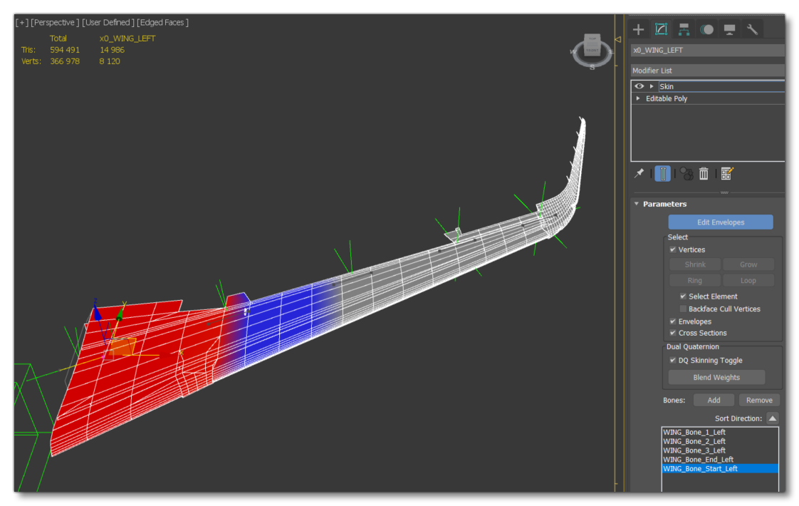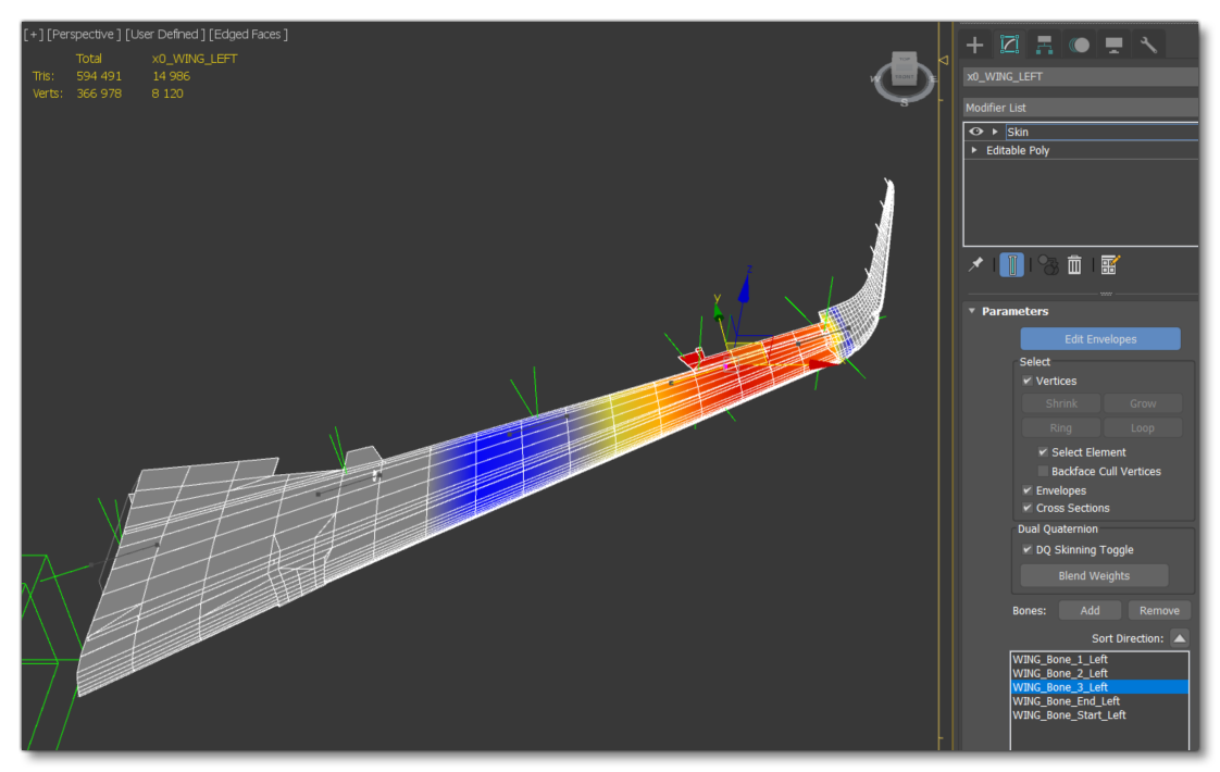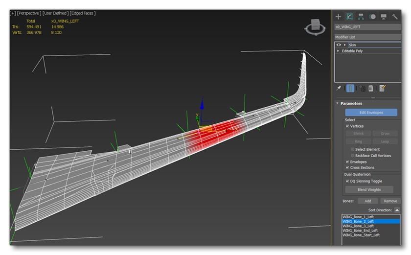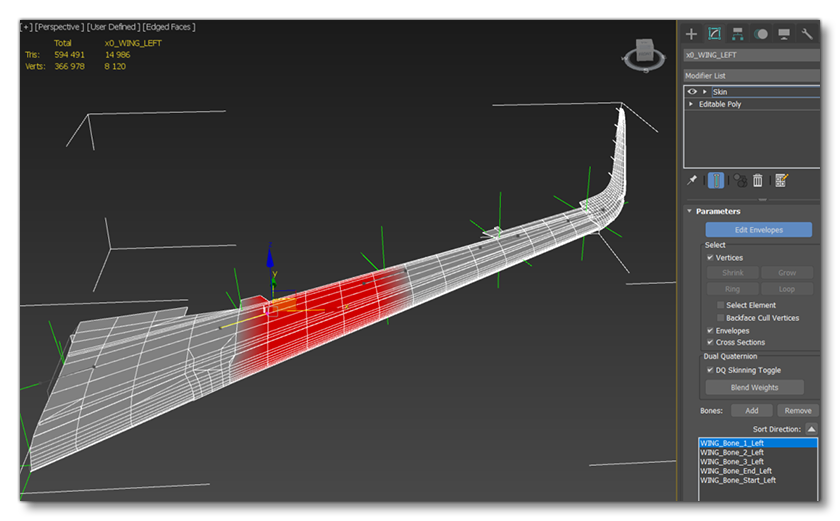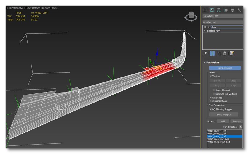 Now we have all the helpers we need to skin the main part of the wing. For that we need to select all your helpers along with the wing's node. We recommend that you isolate them to have a clean viewport. Next, we select our wing and add a skin modifier, and to that we add all the helpers we've created to "Bones" in the modifier. We also set the bone affect limit to 4, and check "Show No Envelopes":