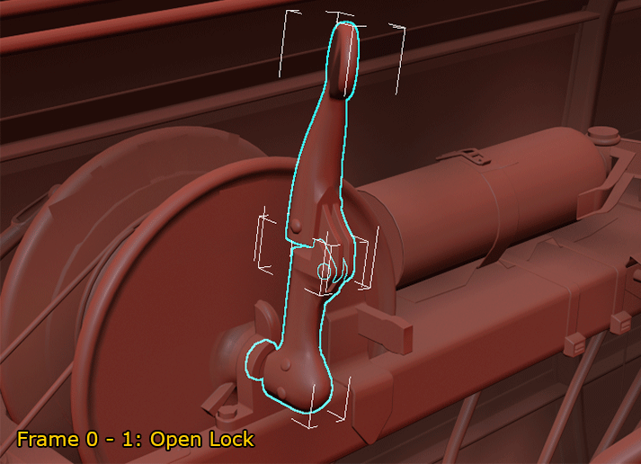 In cockpits, you can find lots of different levers, and they all have different shapes and very different uses. However they are almost always going to be animated using two frames, or - at most - a few frames of linear animation, as shown in the images above. Just keep in mind that they need to have the first frame of their animation at the position where they are not yet engaged, and the last frame of their animation where they are fully engaged.