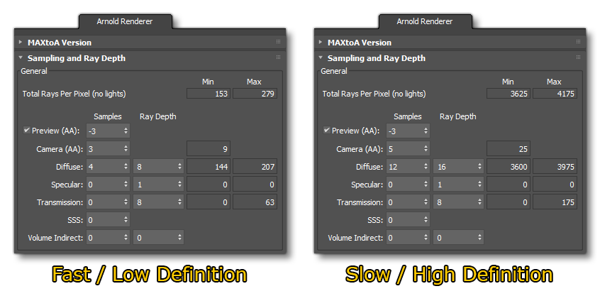 The following images show the essential setup values for the renderer: one for low definition/fast rendering, and the other for high definition/slow rendering: